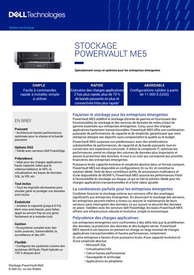 Dell PowerVault ME5 offre un stockage haute performance et économique, conçu spécifiquement pour les environnements virtualisés tels que VMware vSphere et Microsoft Hyper-V. Avec jusqu’à 800 000 IOPS, des contrôleurs actifs doubles et des options de connectivité flexibles (iSCSI, Fibre Channel, SAS), ME5 simplifie la gestion du stockage tout en offrant une fiabilité de niveau entreprise à un prix abordable. La solution propose une intégration transparente, un tiering automatisé et des fonctionnalités natives de protection des données qui évoluent avec les besoins de votre entreprise, sans dépasser votre budget. Téléchargez ce document pour en savoir plus.